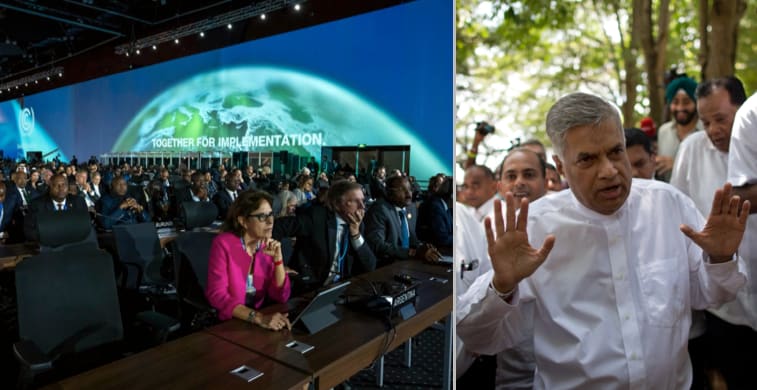 Sri Lankas president Ranil Wickremasinghe påpekar under mötet att det är västs industrialisering som orsakat klimatkrisen, skriver The Guardian.