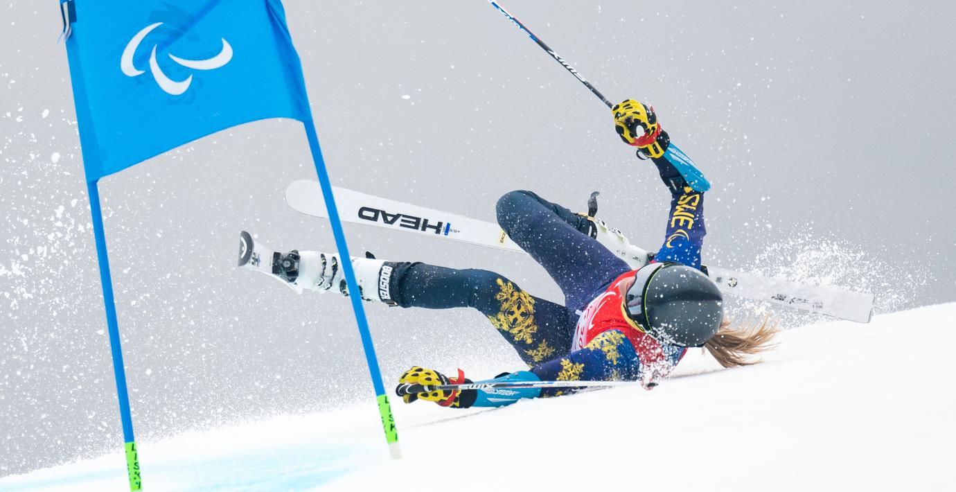 Ebba Årsjö var på väg mot en ny medalj i Paralympics när hon kraschade våldsamt i det andra åket av storslalomen. Hon blev liggandes i backen och fick hjälp av personal på plats för att ta sig ner, rapporterar SVT Sport.