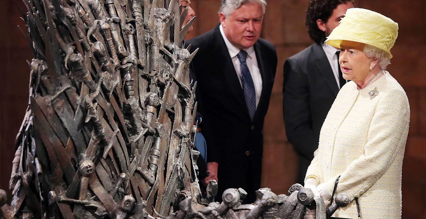 I dag besökte drottning Elizabeth II, tillsammans med Prins Phillip, inspelningsplatsen för Game of Thrones i Nordirlands huvudstad Belfast. Bland annat fick kungligheterna ta en nära titt på seriens omtalade järntron. Drottningen beundrade tronen ett bra tag men motstod frestelsen att sätta sig på den, rapporterar flera medier. Möjligtvis tycker Elizabeth att hon klarar sig bra utan de sju kungarikena i George RR Martins värld – hon är ju trots allt redan drottning för de 53 staterna i brittiska samväldet, skriver nyhetsbyrån TT.