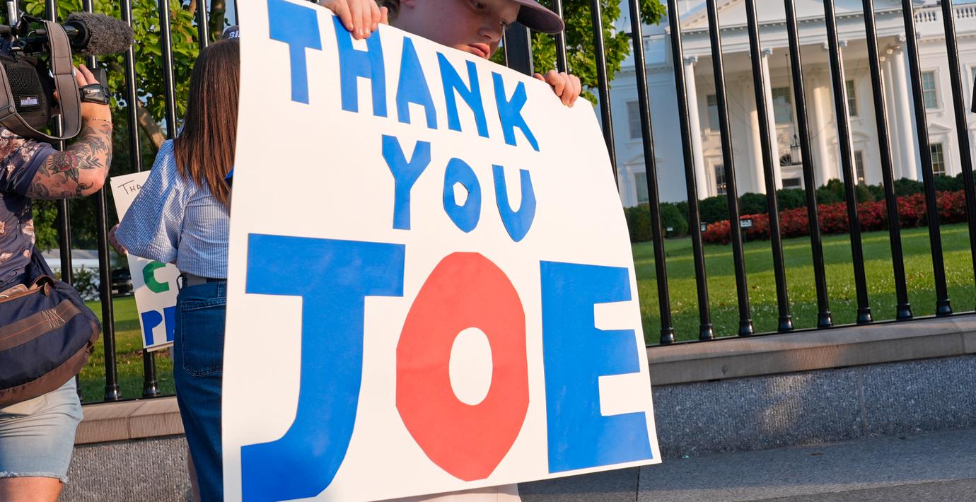En pojke håller en skylt där det står ”Thank you Joe” utanför Vita huset i Washington på söndagen. (Susan Walsh / AP)