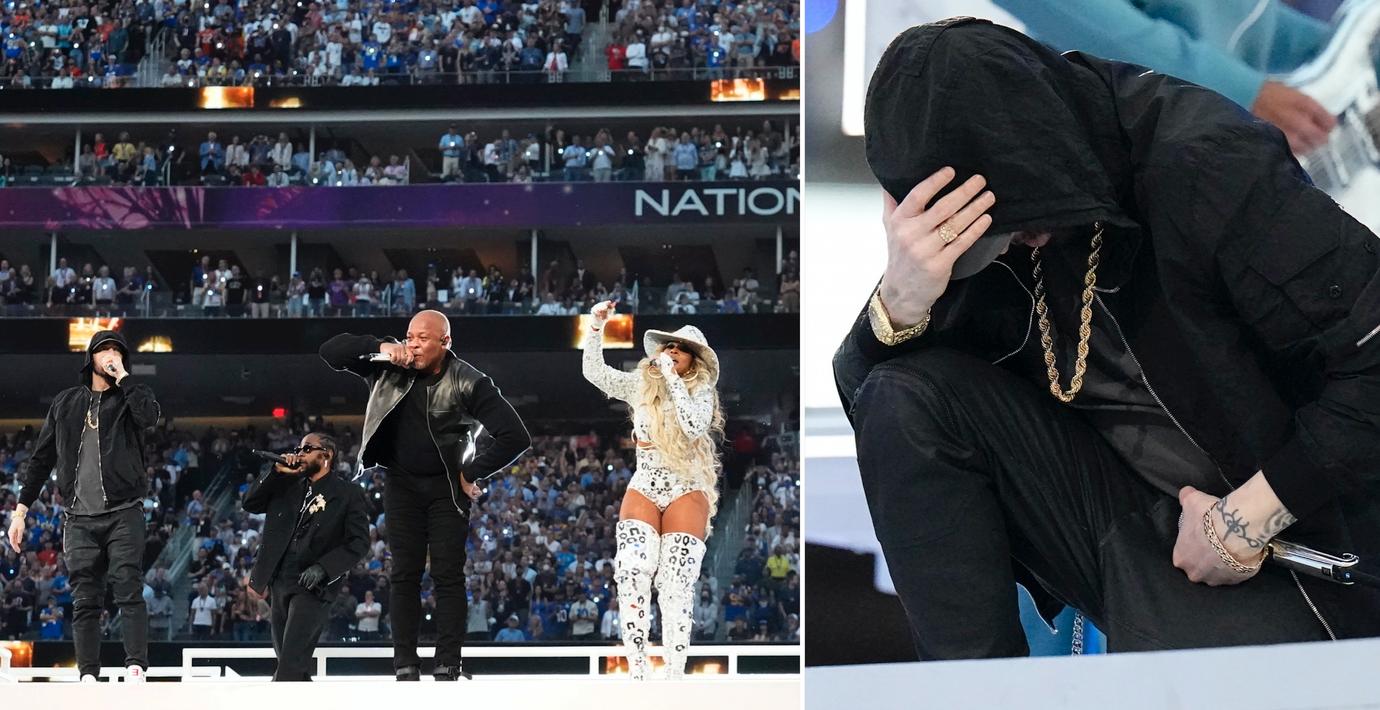 Spekulationer inför Super Bowl gjorde gällande att Eminem skulle förbjudas att knäböja, skriver Huffington Post. Dessutom spekulerades det i att Dr Dre skulle förbjudas att rappa ”Still not lovin’ the police” – något han gjorde ändå.