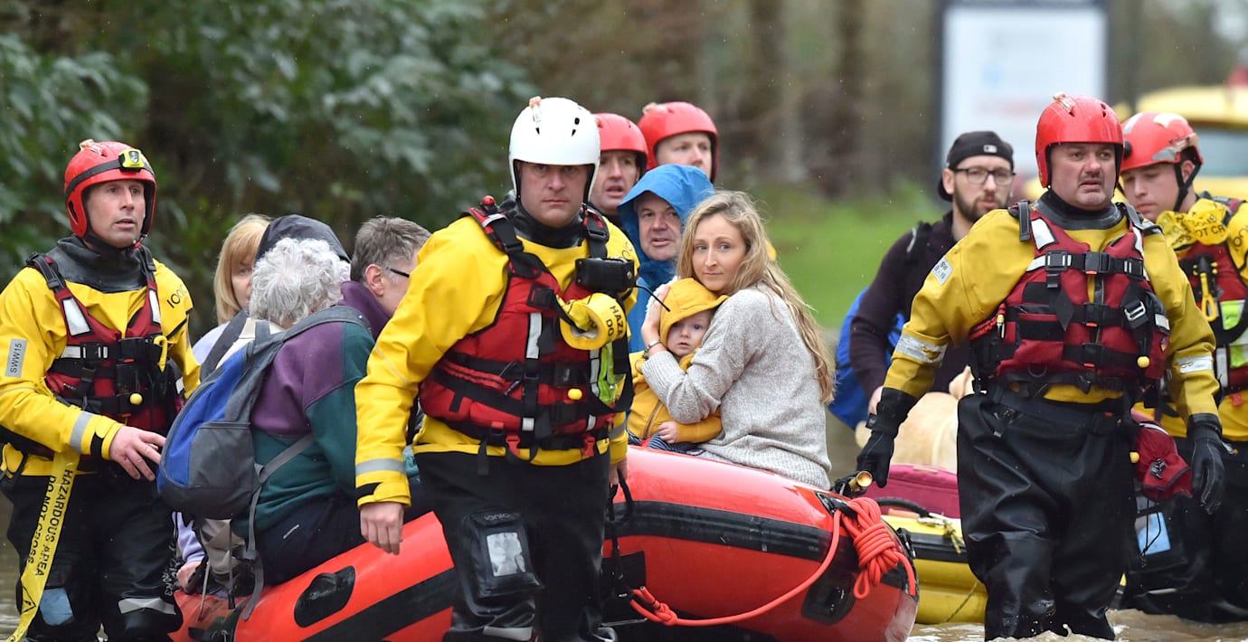 I Storbritannien dog en man tidigare under söndagen i stormen Dennis när han ramlade ner i en flod i södra Wales. Regionen hör till de hårdast drabbade och nödställda undsätts med hjälp av båtar och helikoptrar.