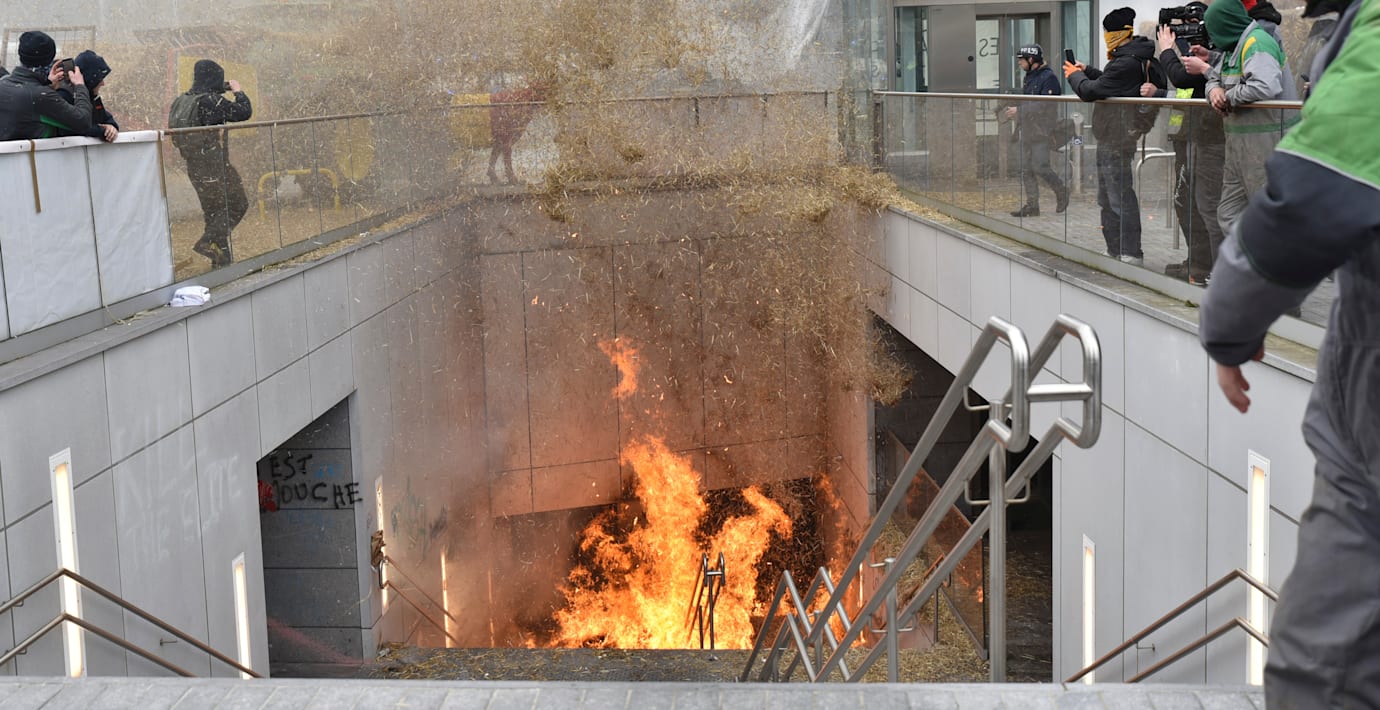 Några stenkast från ministermötet har demonstranter eldat halmbalar och däck samt kastat smällare och ägg mot poliser, som svarat med tårgas och vattenkanoner, rapporterar Politico. Traktorer har också blockerat vägar in till flera EU-institutioner.