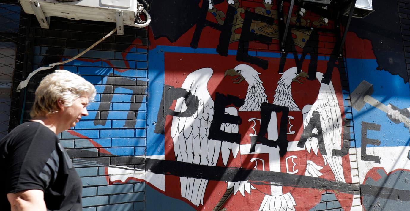 Kvinna i staden Mitrovica vid en graffitimålning med texten ”Vi ger oss inte” (Bojan Slavkovic / AP)