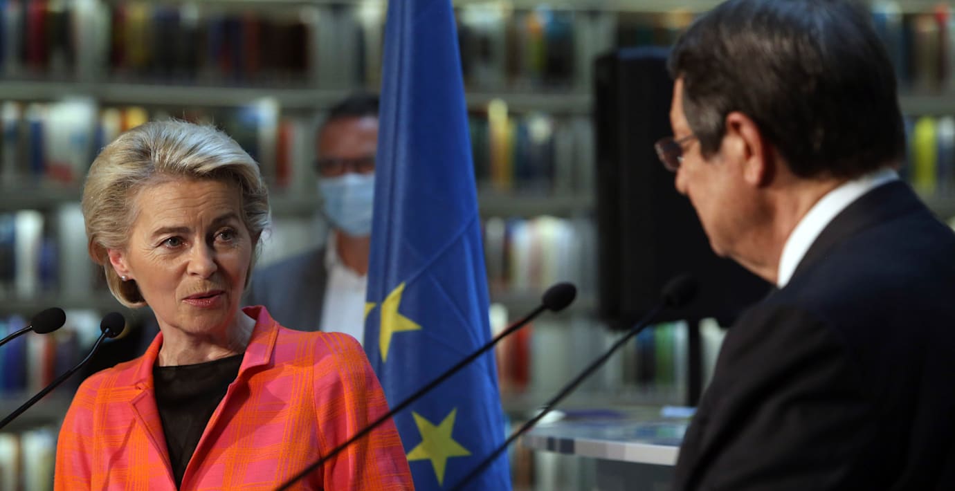 Leyen besöker ön och säger till journalister på plats att ”vi står fast vid det och är eniga, och det här är vad Cypern kan vänta sig”.