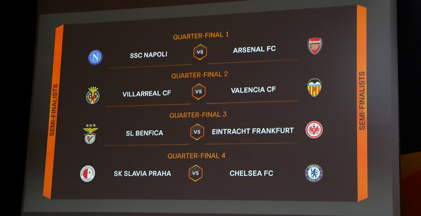 I semifinalerna möts Arsenal/Napoli-Villarreal/Valencia och Benfica/Frankfurt-Slavia Prag/Chelsea.