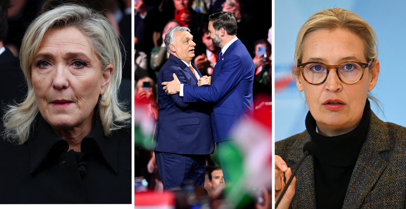 Marine Le Pen från Nationell samlin / Orbán och JD Vance / AFD:s partiledare Alice Veidel (AP)