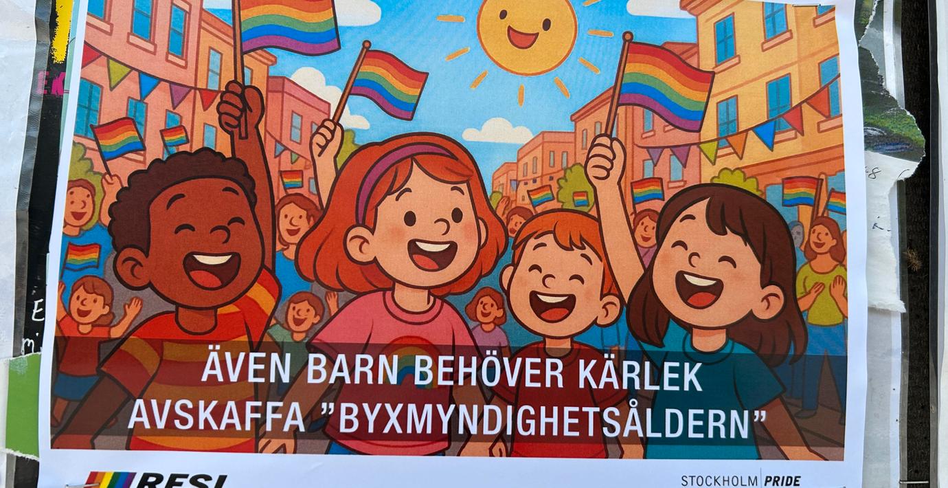 ”Även barn behöver kärlek – avskaffa byxmyndighetsåldern”, står det på de falska affischerna som enligt P4 Stockholm satts upp över södra Stockholm.