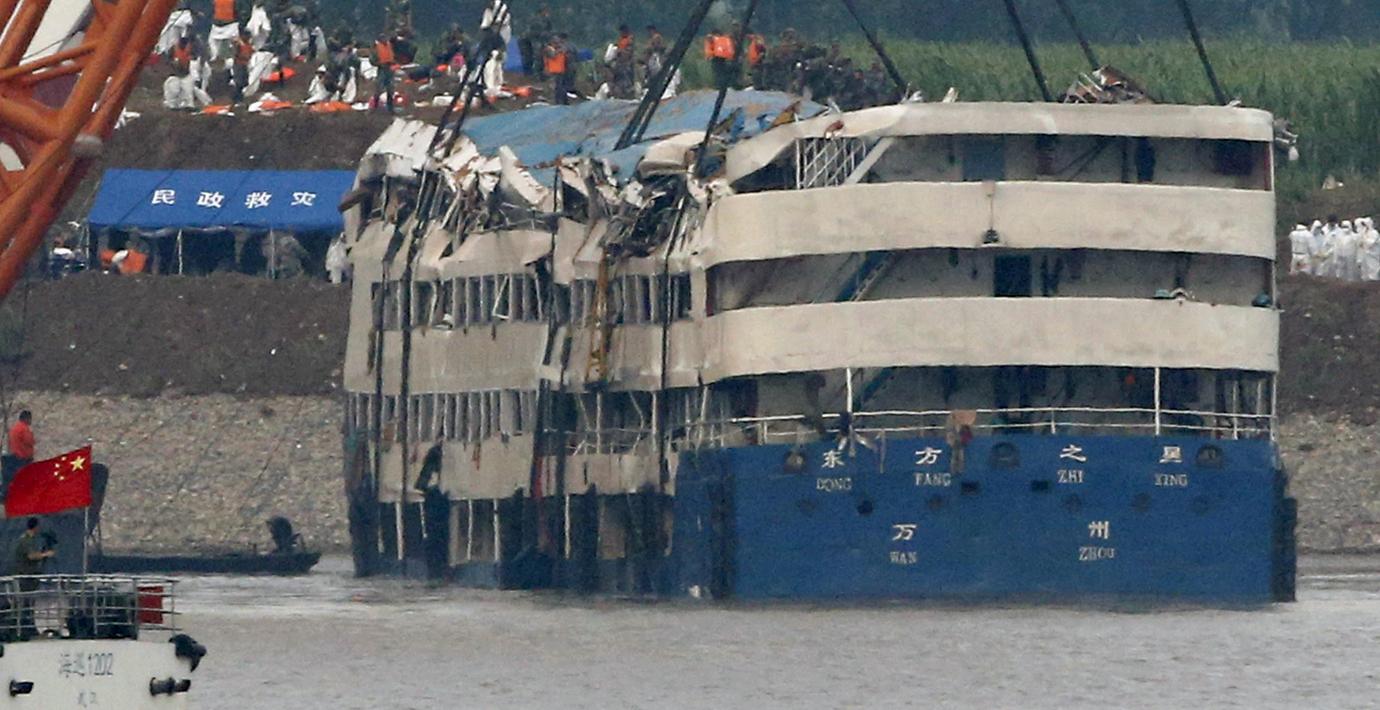 Passagerarfartyget som kapsejsade i Yangzefloden i Kina har nu lyfts upp med hjälp av kranar. Lyftet av vraket gjordes för att underlätta arbetet med att hitta alla de döda som finns i fartygskroppen.