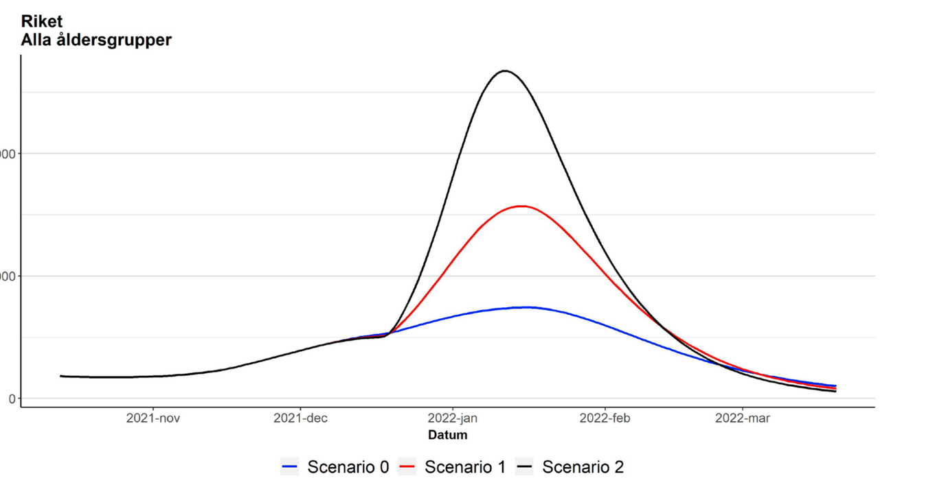 Folkhälsomyndigheten presenterar tre nya scenarier för smittspridningen framöver. I samtliga scenarier antar myndigheten att omikron är 25 procent mer smittsam än deltavarianten – och man räknar då med att smittotoppen nås i mitten av januari.