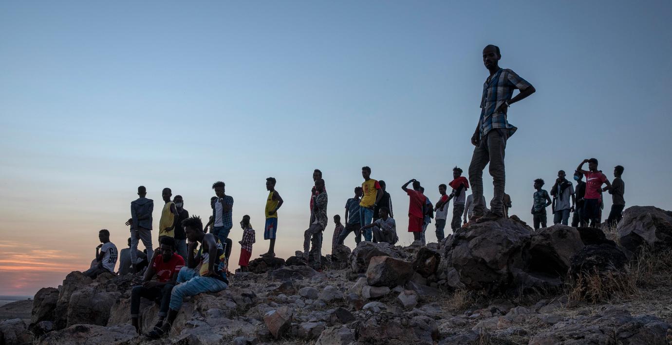 Människor som flytt Tigrayregionen står på en höjd ovanför flyktinglägret Um Raquba i Qadarif i östra Sudan (Nariman El-Mofty / TT NYHETSBYRÅN)