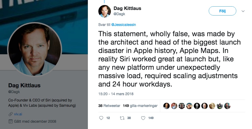 Häromdagen publicerade The Information en lång artikel där utvecklingen av Apples AI-assistent Siri kritiserades hårt av många före detta Apple-anställda. Bland annat hävdade den tidigare Apple-chefen Robert Williamson att Siri redan från början var dåligt kodad och full med buggar. Men påståendena har fått Dag Kittlaus – medgrundare av Siri och även han tidigare Apple-anställd – att reagera starkt. Kittlaus menar att uttalandena om koden är rakt igenom felaktiga och påpekar via Twitter att de kommer från personens som låg bakom ”Apple-historiens största lanseringskatastrof” i form av karttjänsten Apple Maps.