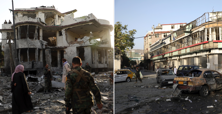 Bilder från afghanska huvudstaden Kabul visar omfattande förstörelse efter den koordinerade attacken av talibanerna på tisdagskvällen, skriver BBC. En kraftig bilbomb utlöstes av en självmordsbombare utanför försvarsminister Bismillah Khans bostad.
