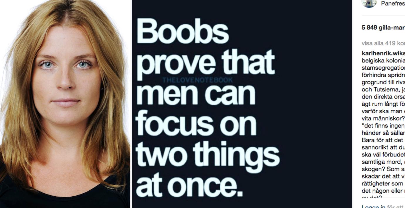 Men att skämta om män ”som någon form av neandertalare som tänker med kuken underminerar knappast jämställdhetskampen år 2017. Det är på sin höjd väldigt trött humor”, avslutar hon.