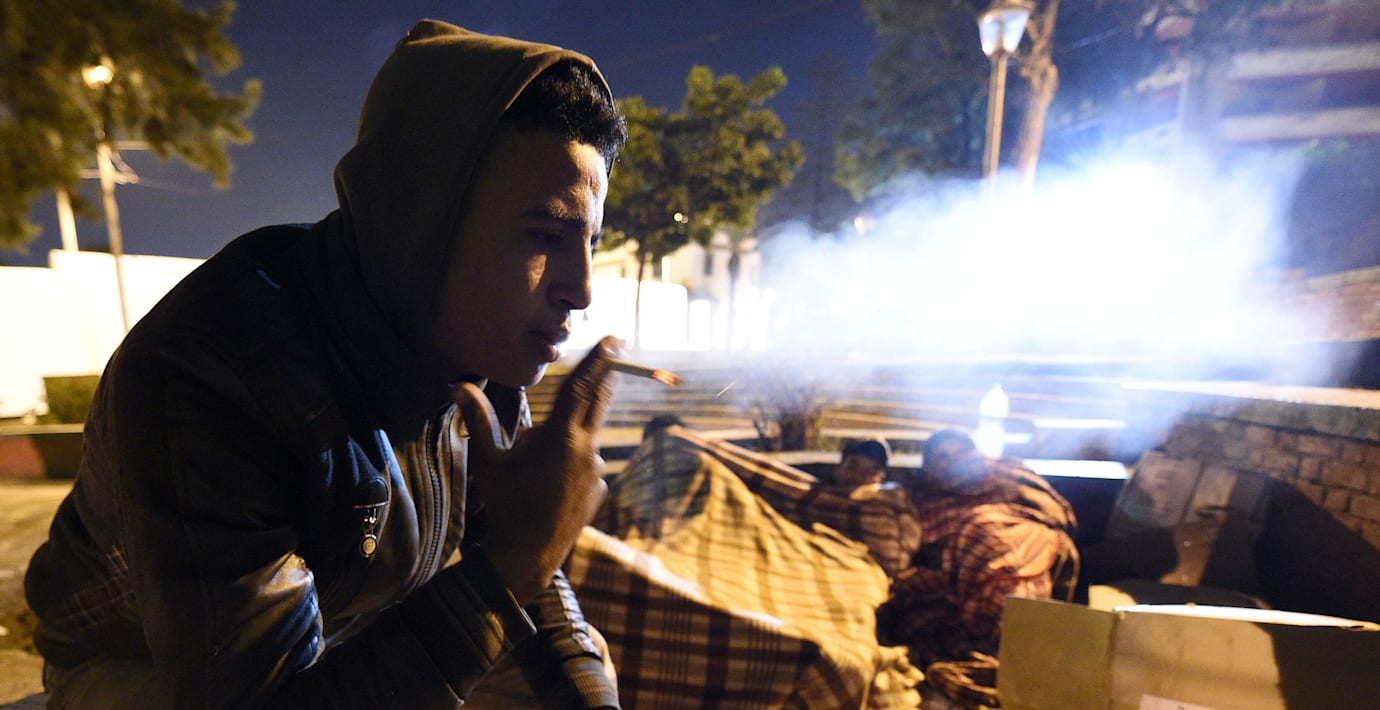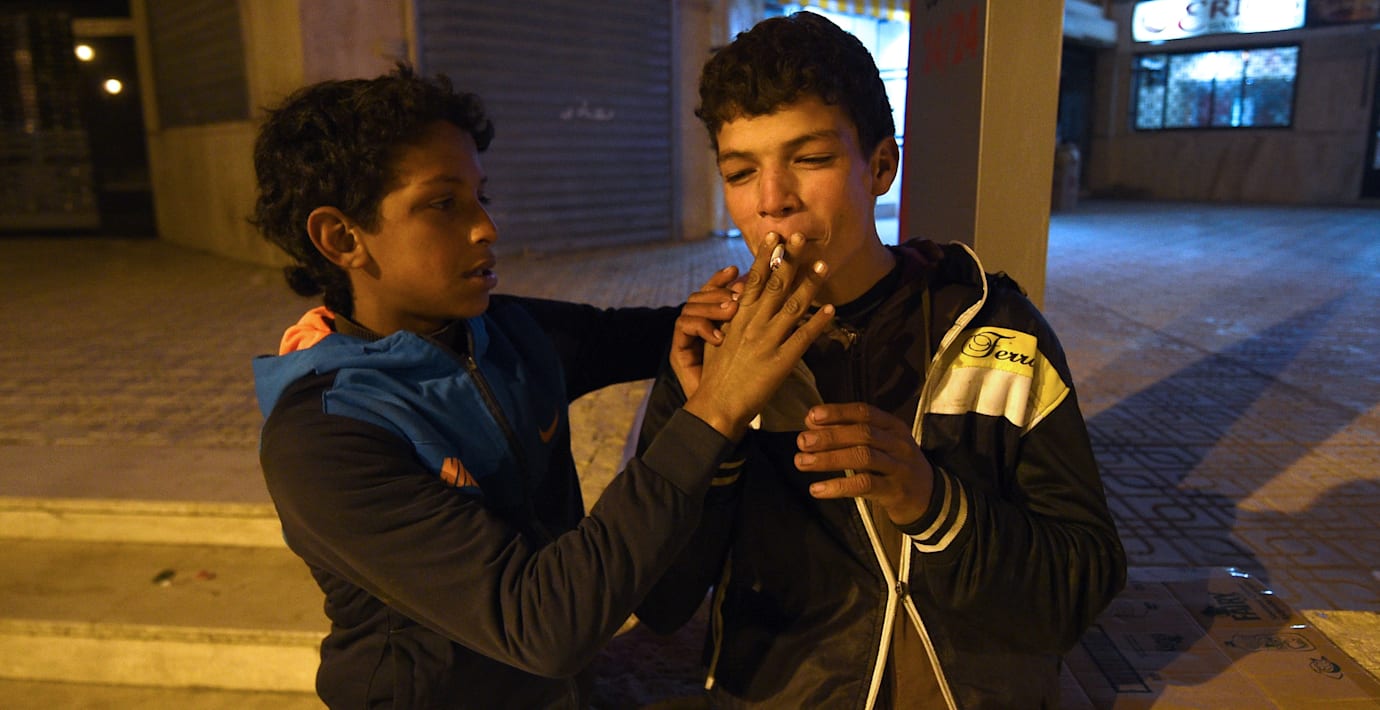 Han sitter på en gata i Tanger med tre kamrater och sniffar lim och röker hasch. Den som inte stjäl, kan inte äta, konstaterar han.