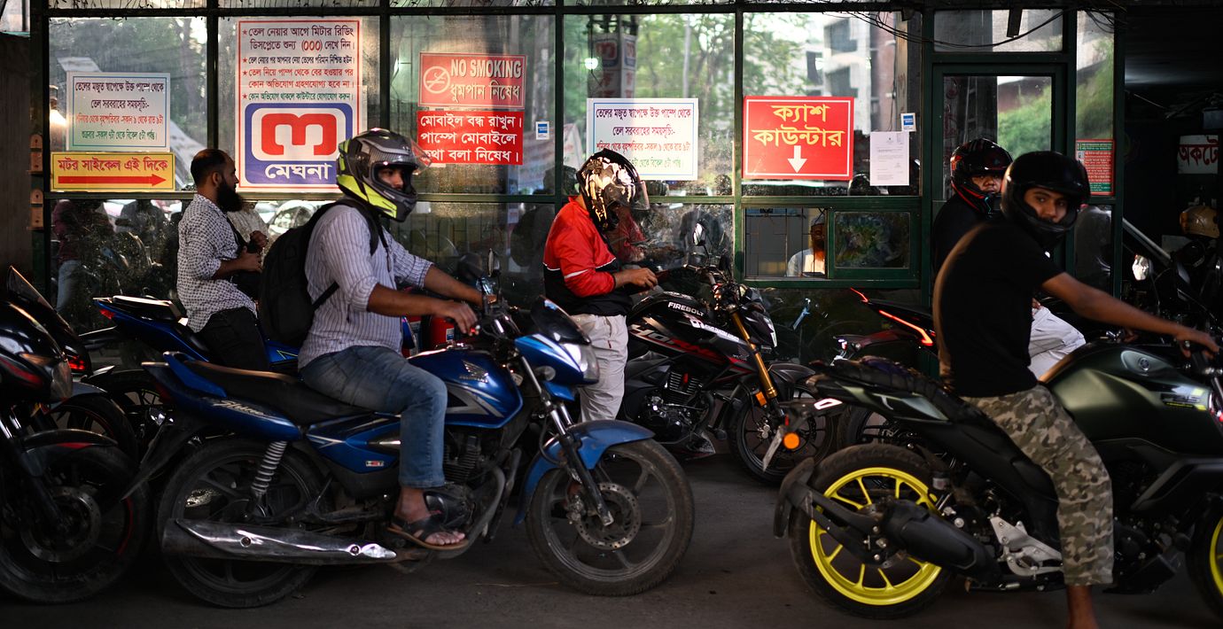 Långa köer av motorcyklar ringlar mot Dhakas bensinstationer. Många av dem som väntar är gig-arbetare som får allt svårare att få ihop det under bränslekrisen, skriver Rest of World.