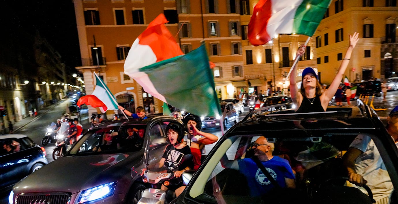 Italienarna firade med flaggor, fyrverkerier, dans och bad i Fontana di Trevi i Rom i natt efter finalvinsten mot England.