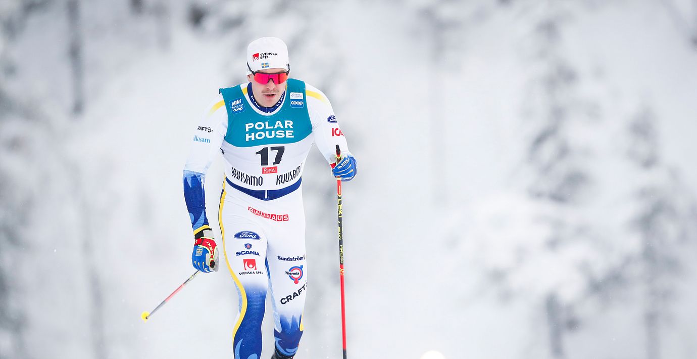 Marcus Grate klev på sin egen skida och föll i en uppförsbacke i kvartsfinalen i sprinten i världscupsprinten i Ruka.