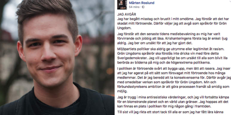 Grön Ungdoms språkrör Mårten Roslund avgår efter en uppmärksammad festkväll på Grand Hôtel i Stockholm där Roslund träffat tidigare SDU-toppar. ”Jag har begått misstag och brustit i mitt omdöme”, skriver Roslund på Facebook. Han fortsätter: