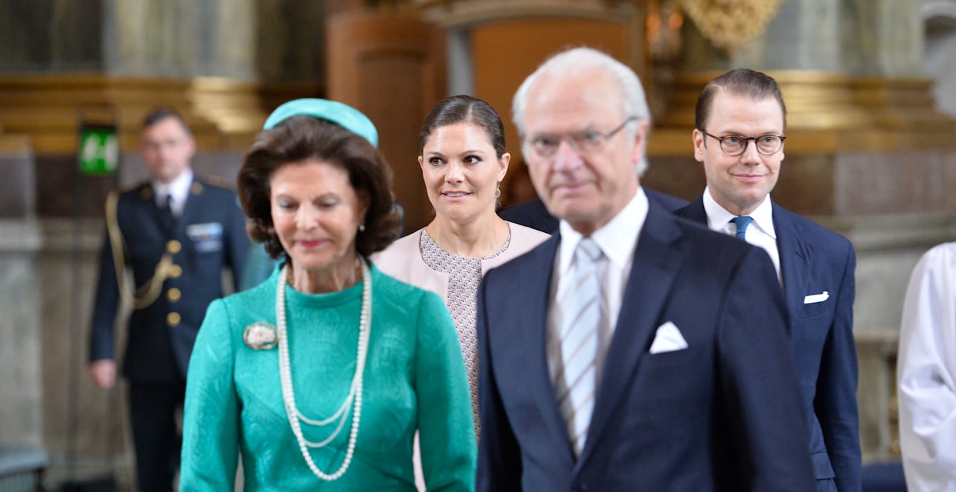Kungen, drottningen, kronprinsessan Victoria, prins Daniel och den nyblivne tvåbarnsfadern Christopher O'Neill är på plats. Efter en inledande trumpetfanfar sjungs ”Deo dicamus gratias” – ”Herre, vår Gud, vi tacka dig”.