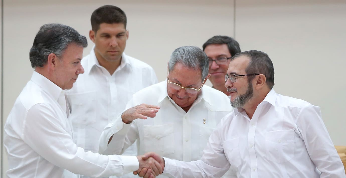 Sent på onsdagen skakade Colombias president Juan Manuel Santos och Farc-ledaren Rodrigo Londoño hand i Kubas huvudstad Havanna. Handslaget innebar ett löfte att få ett slut på Latinamerikas längsta krig, som har krävt över 220 000 dödsoffer, uppger TT.