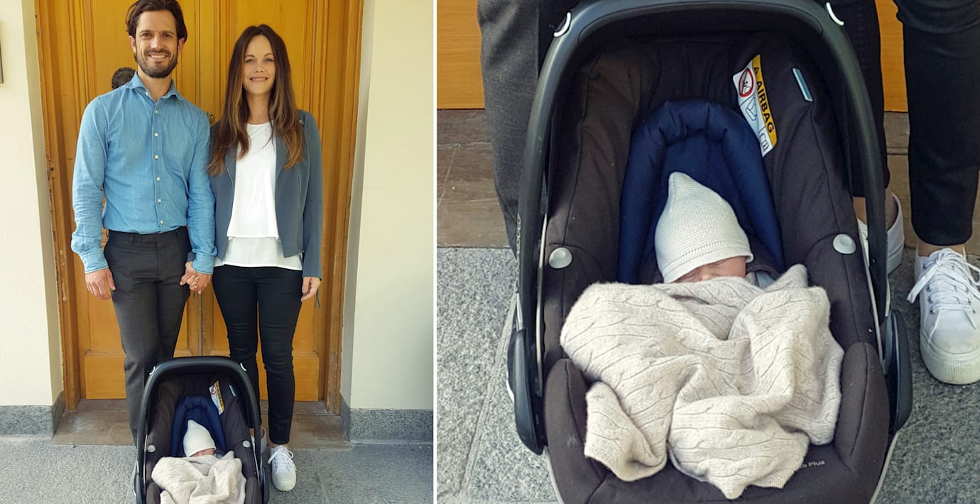 Det lyckliga prinsparet Carl Philip och Sofia med den nyfödde lille prinsen i ett babyskydd. Nu visar paret upp det senaste tillskottet i familjen för världen – för första gången.