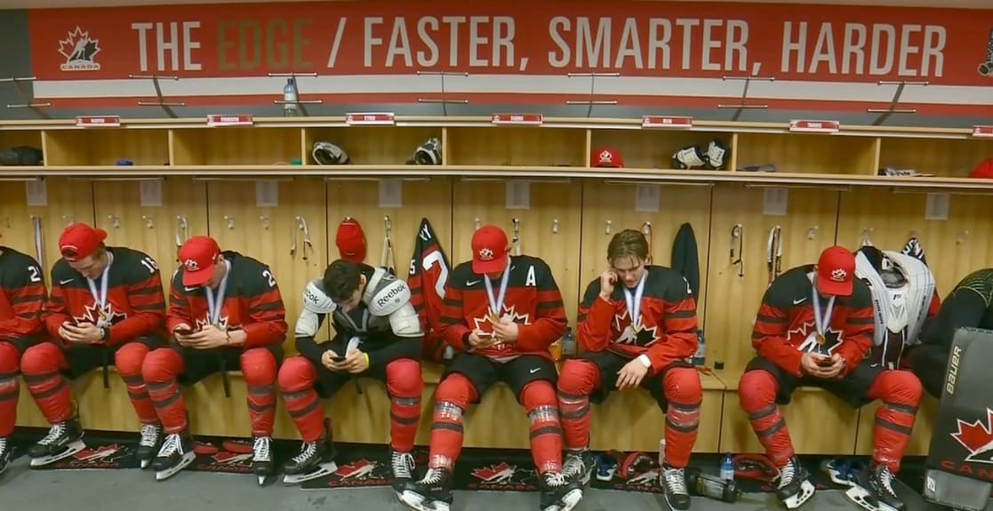 Kanadas JVM-lag vann finalen mot Sverige, lyfte bucklan, gick in i omklädningsrummet – och dök ner i sina mobiler. Kanadensiska tv-kanalen Sportsnet fångade det långt ifrån vilda guldfirandet och twittrade: