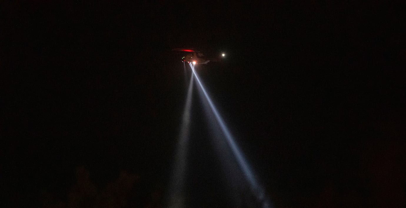 Polisen larmades vid 20-tiden om att en helikopter skickat ut ett nödlarm och sedan försvunnit. En räddningsinsats inleddes och flera personer upptäcktes kort därefter i vattnet. Räddningsledaren uppger för NRK att personerna befann sig i vattnet i omkring 50 minuter.