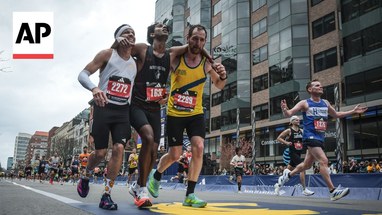 Två löpare hyllas för att ha hjälpt en medtävlande över mållinjen i Boston Marathon i måndags, skriver flera medier.