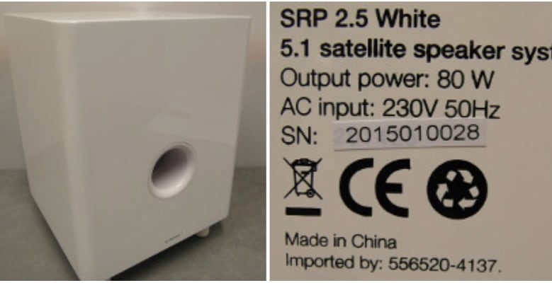 En hemmabiohögtalare av fabrikatet Andersson med modellnummer SRP 2.5 har meddelats försäljningsförbud av Elsäkerhetsverket. Netonnet, som säljer högtalaren, har ålagts att varna för den.