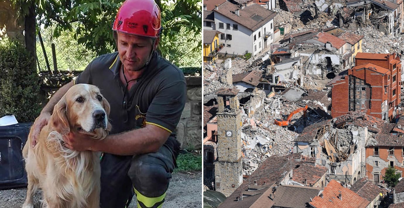 Plötsligt hörde räddningsarbetarna hundskall när de skulle hjälpa en man i Amatrice att hämta kläder och andra tillhörigheter från bostaden som förstördes i jordbävningen. Det visade sig vara Romeo, en golden retriever, som över en vecka efter skalvet kunde återförenas med sin husse.