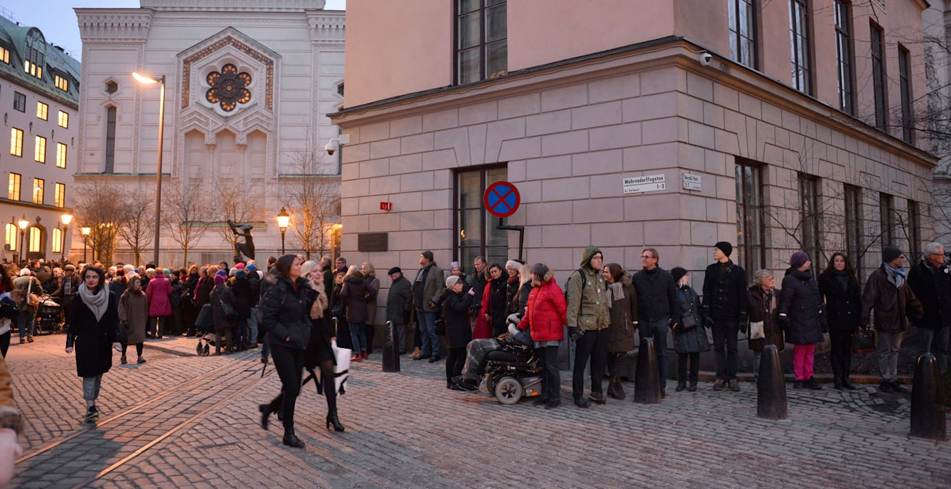 Uppemot tusen personer samlades sent på fredagseftermiddagen för att bilda en ”fredens ring” runt Stockholms synagoga, rapporterar SVT. Manifestationen hölls för att visa stöd och solidaritet efter den senaste tidens antisemitiska attacker. Bland deltagarna fanns statsminister Stefan Löfven, som också talade.