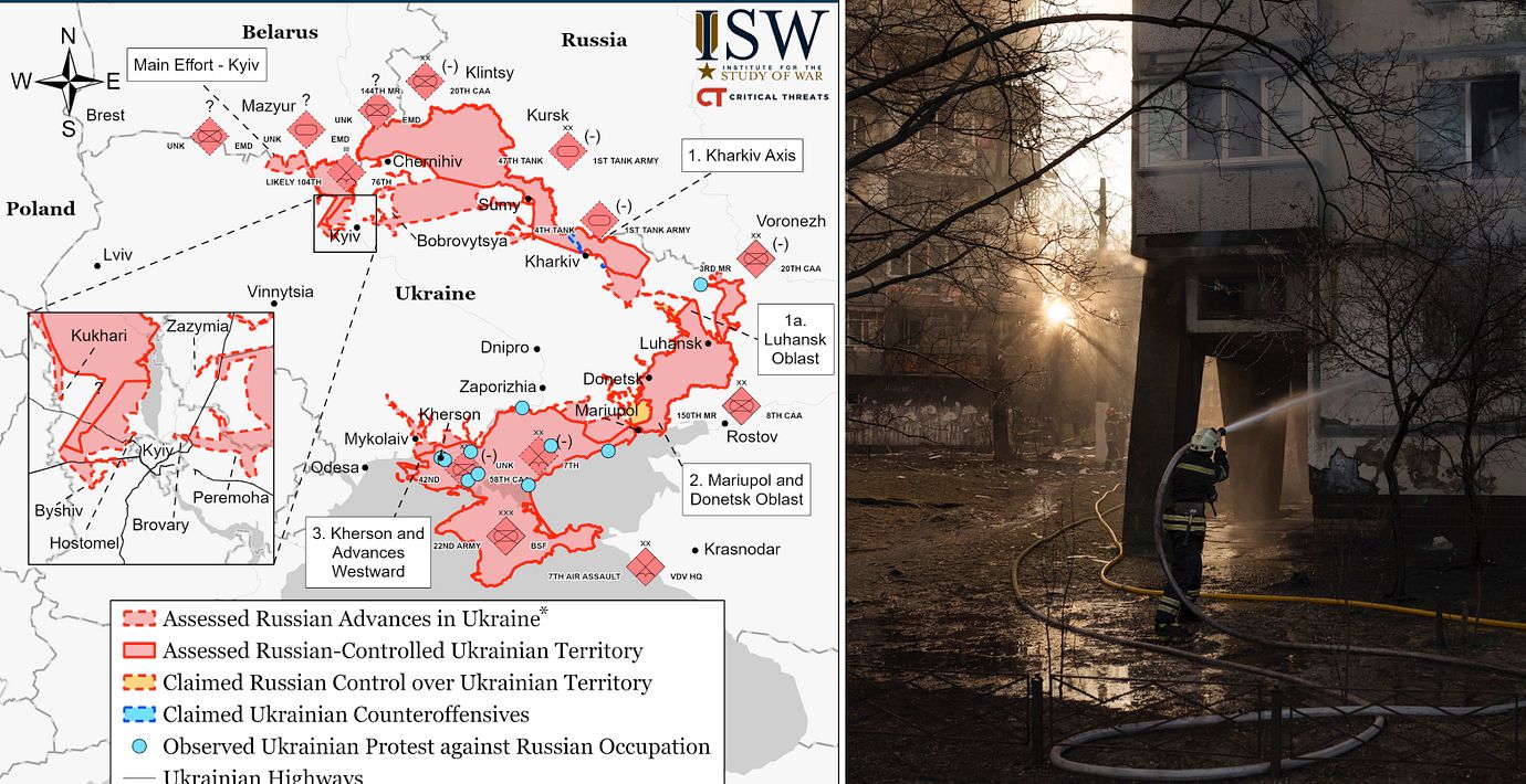 Rysslands trupper har inte gjort några större rörelser kring Ukrainas huvudstad Kyiv, skriver den brittiska tankesmedjan Institute for the Study of War i sin senaste rapport. Landet verkar främst fokusera på logistik i både Kyiv och i de södra delarna av landet.