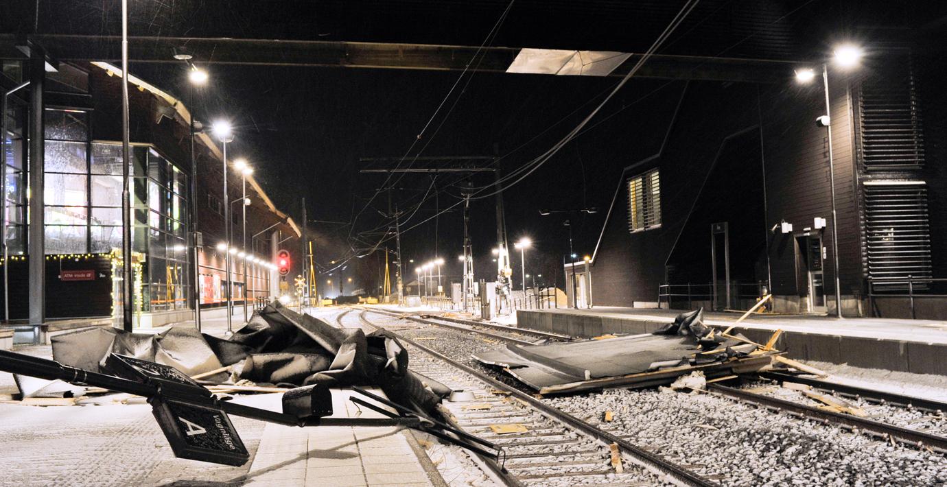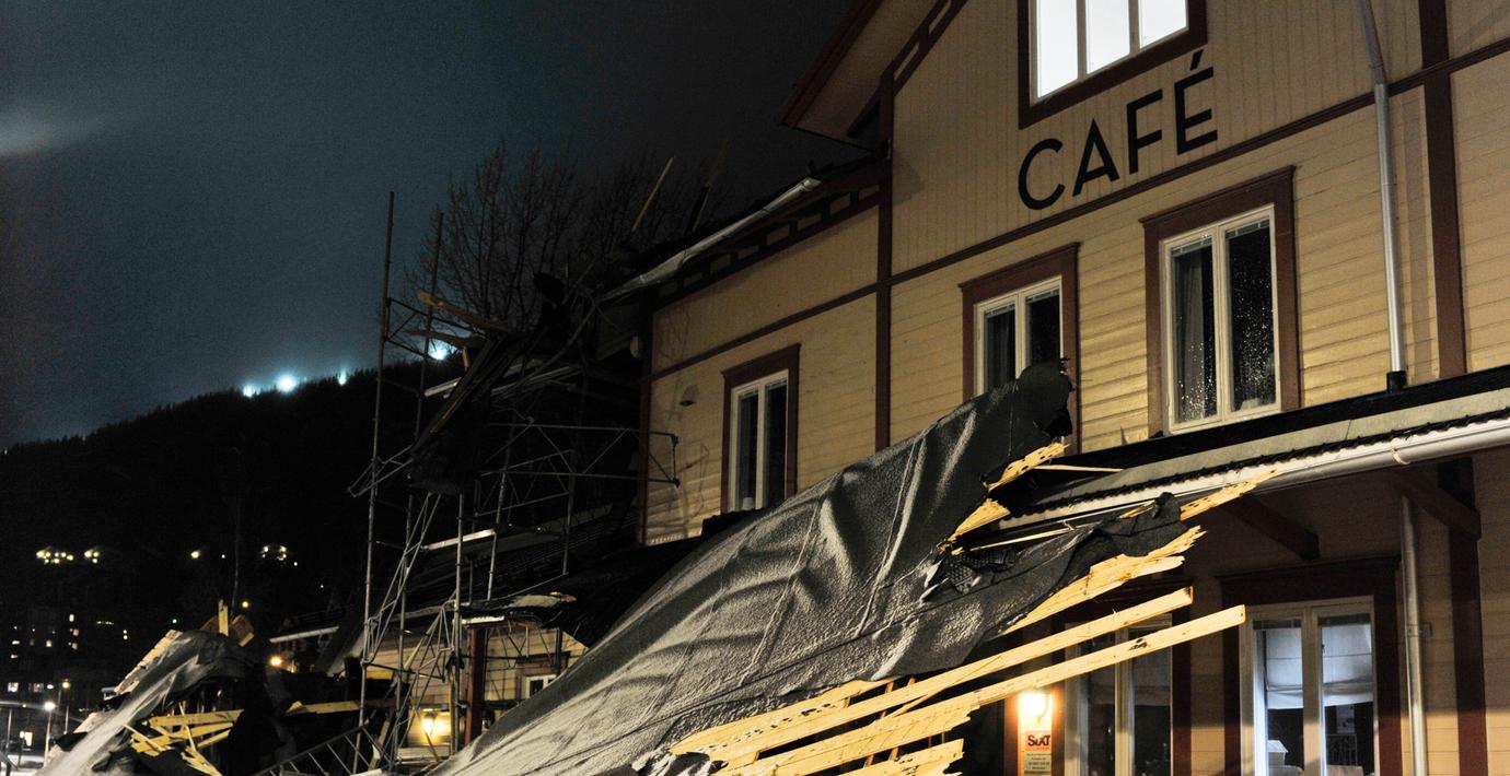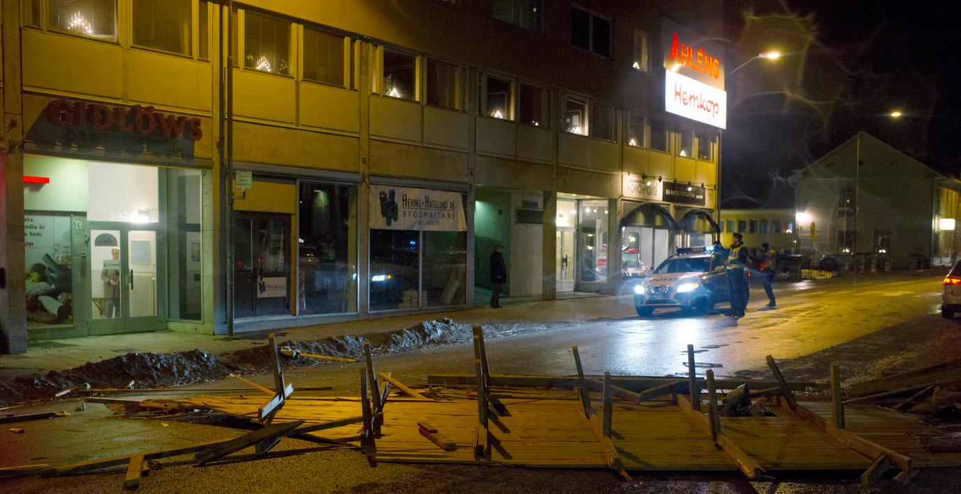 Vägar stängdes och tak blåste sönder i mellersta Norrland i natt. I Åre blåste tågstationens tak in, men då tågen ställts in var ingen i lokalen. I centrala Östersund spärrades gatorna av för att hindra att människor skadades efter att minst fem tak blåst av. Tiotusentals hushåll var strömlösa i natt.