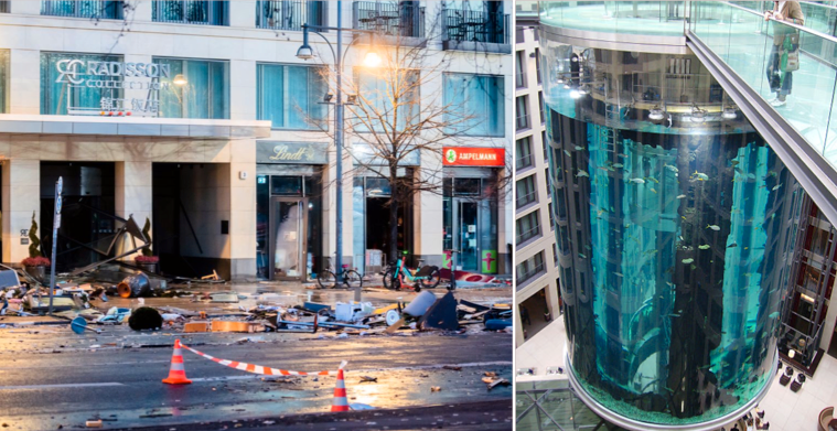 Världens största runda akvarium exploderade på ett hotell i Berlin tidigt på fredagsmorgonen, rapporterar AFP. Miljoner liter vatten och över tusen fiskar forsade ut i byggnaden. Trycket från explosionen krossade dörrar och fönster, och hotellinredning slungades ut på gatan.