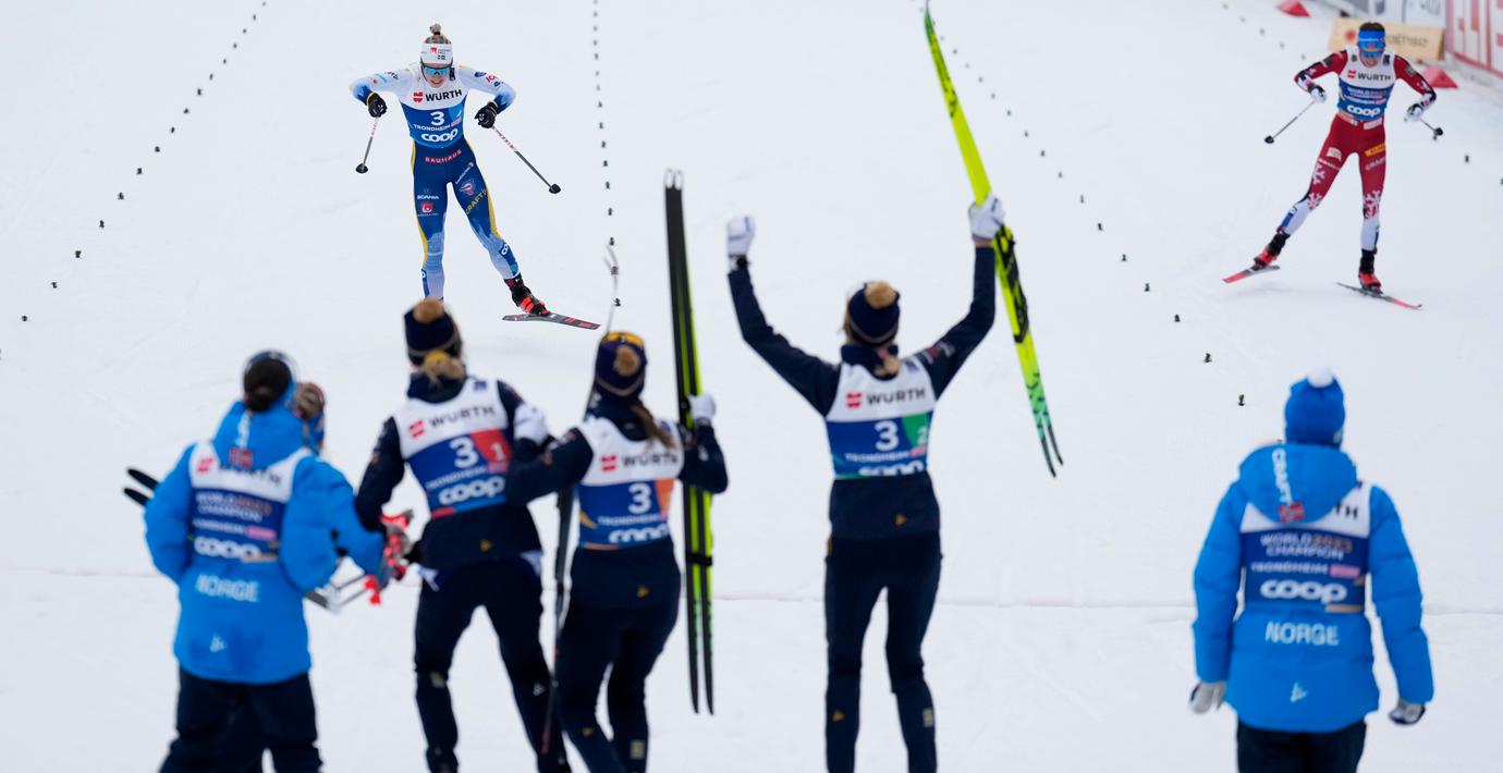 Sverige tar VM-guld på damernas stafett efter en bragdartad insats av Jonna Sundling på den sista sträckan. Svenskan tog in hela 37 sekunder på Norge, som länge hade en stor ledning under loppet.