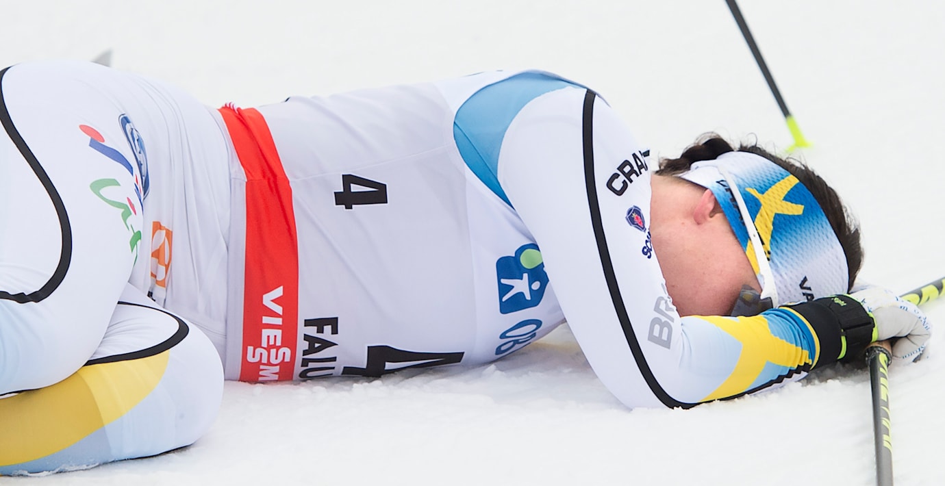 För Kalla tog det stopp i en uppförsbacke när hon jagade norskorna Maiken Caspersen Falla och Ingvild Flugstad Östberg. Där tog hon ett felskär och hamnade på knä.