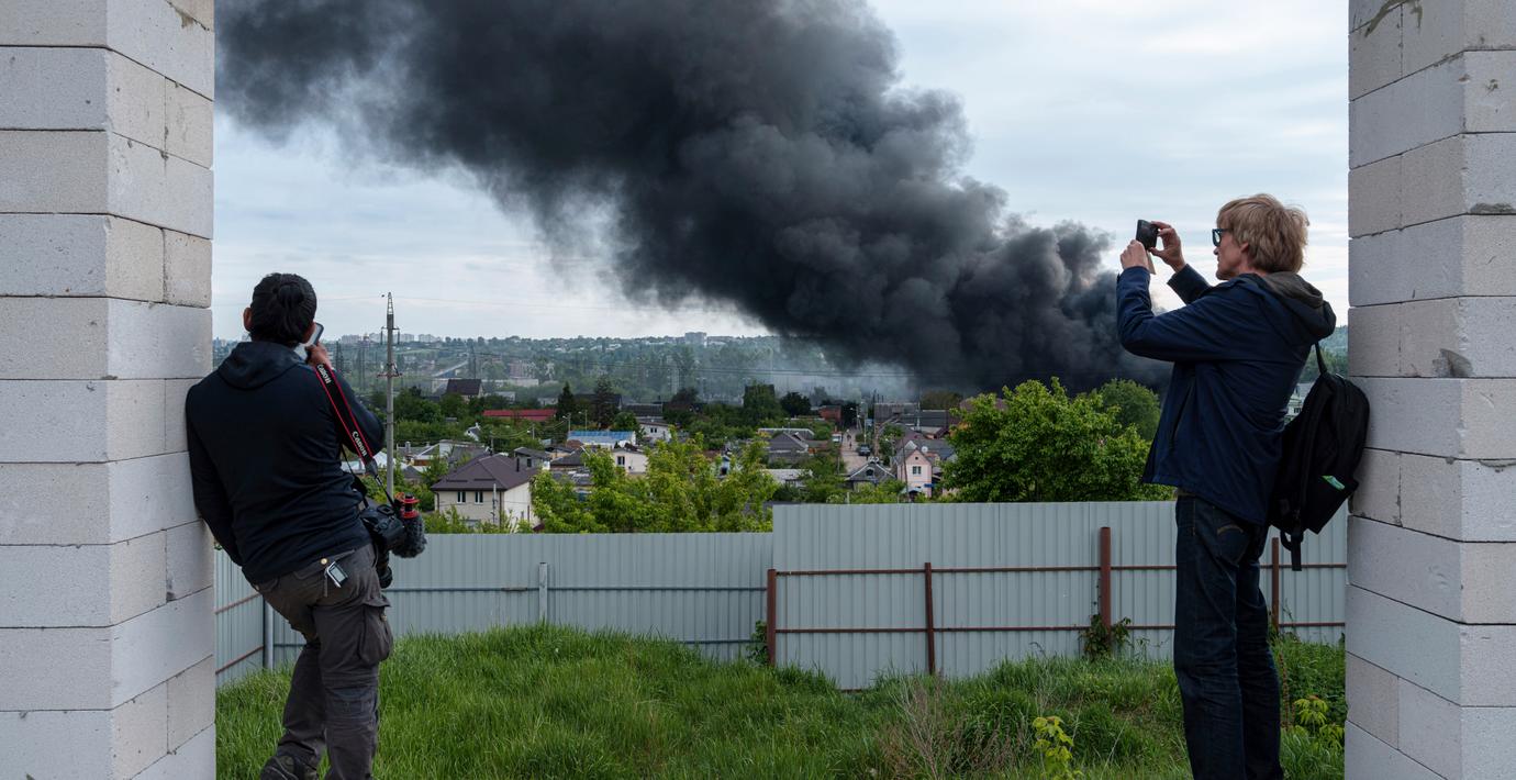 Rök över den ukrainska miljonstaden Charkiv. (Evgeniy Maloletka / AP)