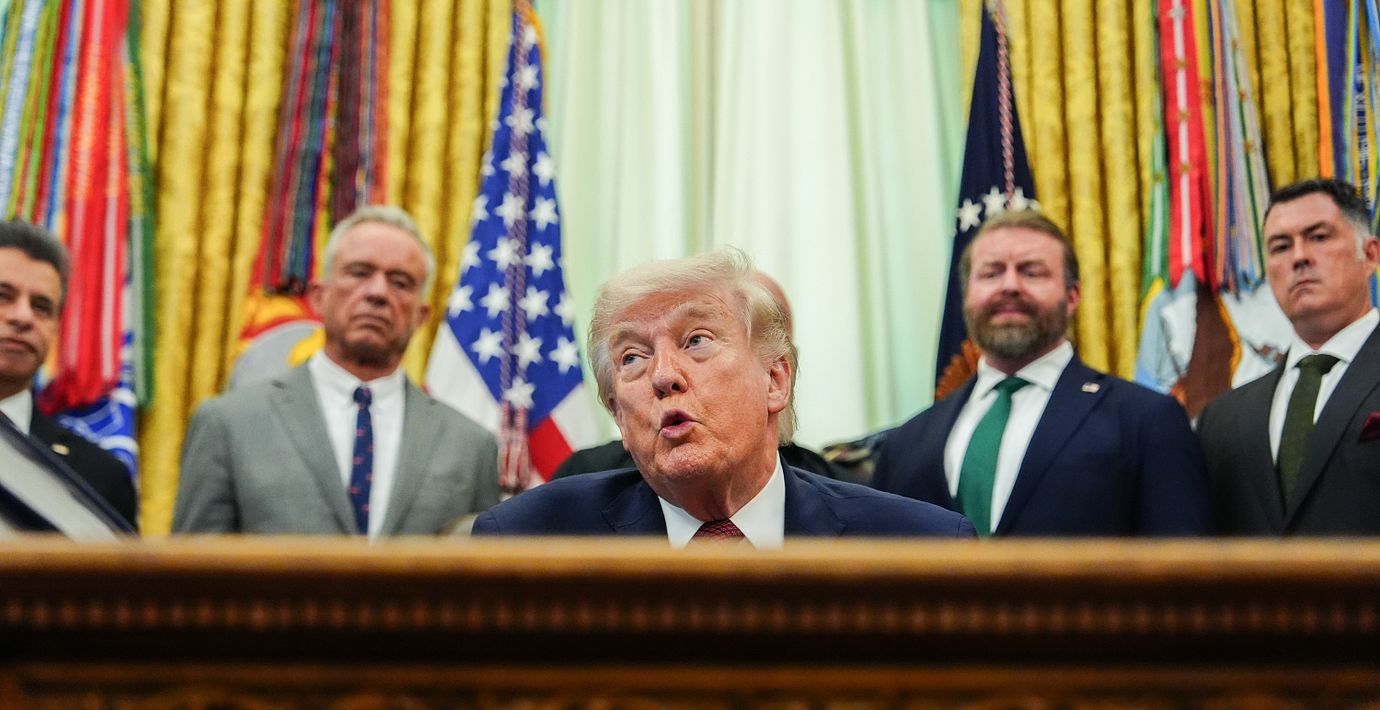 Donald Trump i Vita huset på lördagen. (Julia Demaree Nikhinson/AP/TT)