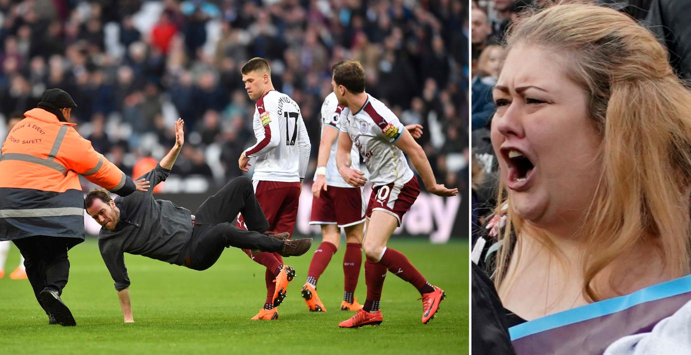 Det utbröt kaos på Olympiastadion i London efter West Hams Premier League-match mot Burnley i dag. West Ham blev utspelat och när Burnley gjorde 2–0 i den 70:e minuten tog sig flera arga hemmasupportrar in på planen. En av supportrarna plockade upp en hörnflagga medan en annan blev nertacklad av West Hams lagkapten Mark Noble.