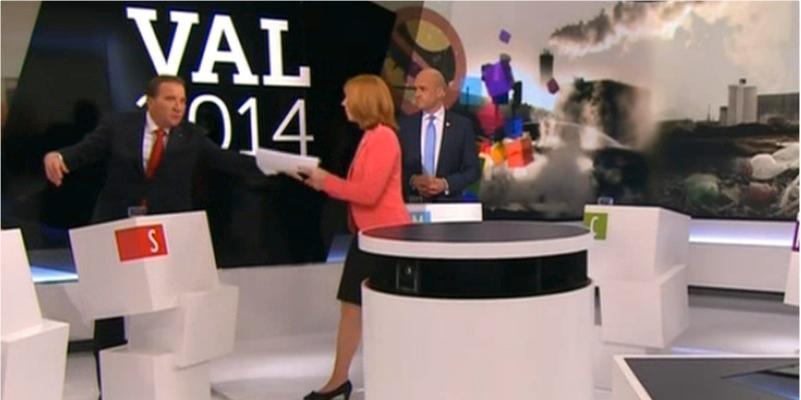 När kärnkraftsfrågan skulle debatteras spårade det ur i TV4 studion. Stefan Löfven föste flera gånger bort Annie Lööfs arm när hon försökte räcka över Energimyndighetens prognoser till S-ledaren. I TV4:s studio efter debatten kallade Per Schlingmann, tidigare partisekreterare för Moderaterna, agerandet för oförskämt.