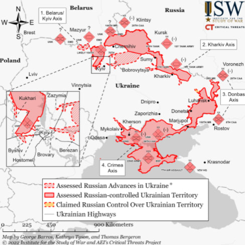 På kartan har de områden som bedöms vara kontrollerade av rysk militär rödmarkerats. Kartan, som har gjorts av Institutet för krigsstudier (ISW), var senast uppdaterad vid 09-tiden på fredagen.