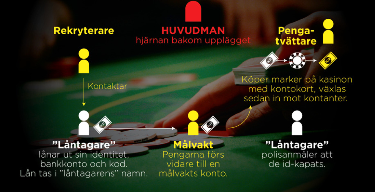 De unga vuxna har deltagit i ett upplägg där de lät sig id-kapas och tillåtit att lån tas i deras namn mot löften om lyxgåvor och pengar. Sedan har pengarna tvättas via spel på kasinon på franska Rivieran.