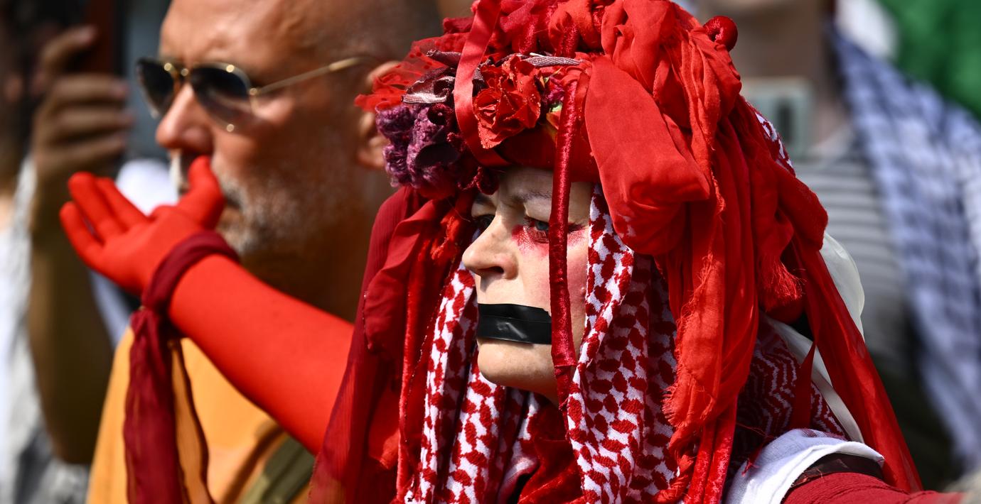 Enligt flera medier handlar det om en grupp Palestinaaktivister som håller en demonstration mot kriget i Gaza under Buschs tal.