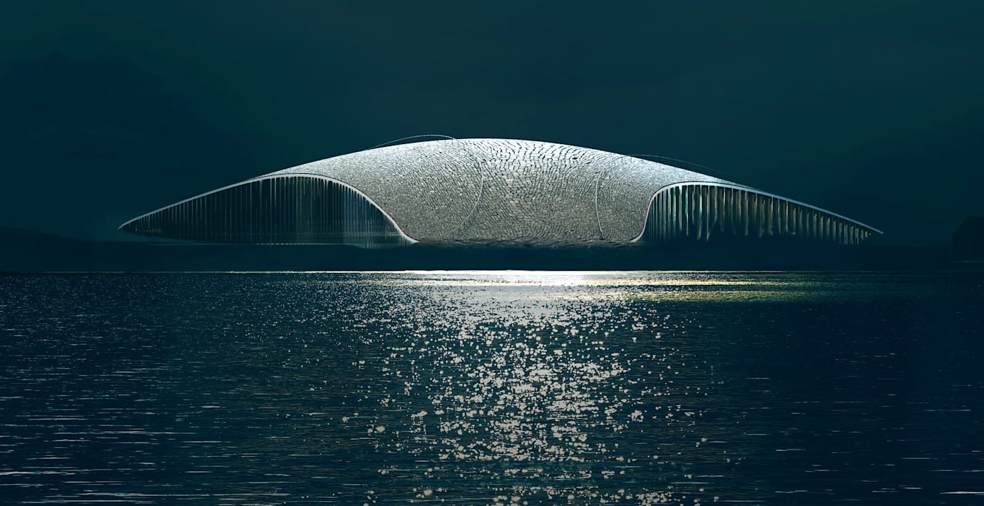Den nya installationen The Whale ligger på ön Andøya strax norr om Lofoten och ser ut som en stjärtfena med ett gigantiskt kurvigt tak som ger intryck av att växa rakt upp ur havet. Turister kan skåda kaskeloter både på taket och genom panoramafönstren inne i byggnaden, där det också finns ett museum och kafé.