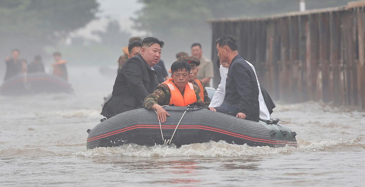 Nya bilder visar hur Nordkoras ledare Kim Jong-Un står med fötterna i lera, åker gummibåt på en översvämmad flod och sitter fast i sin bil med vatten upp till dörren.