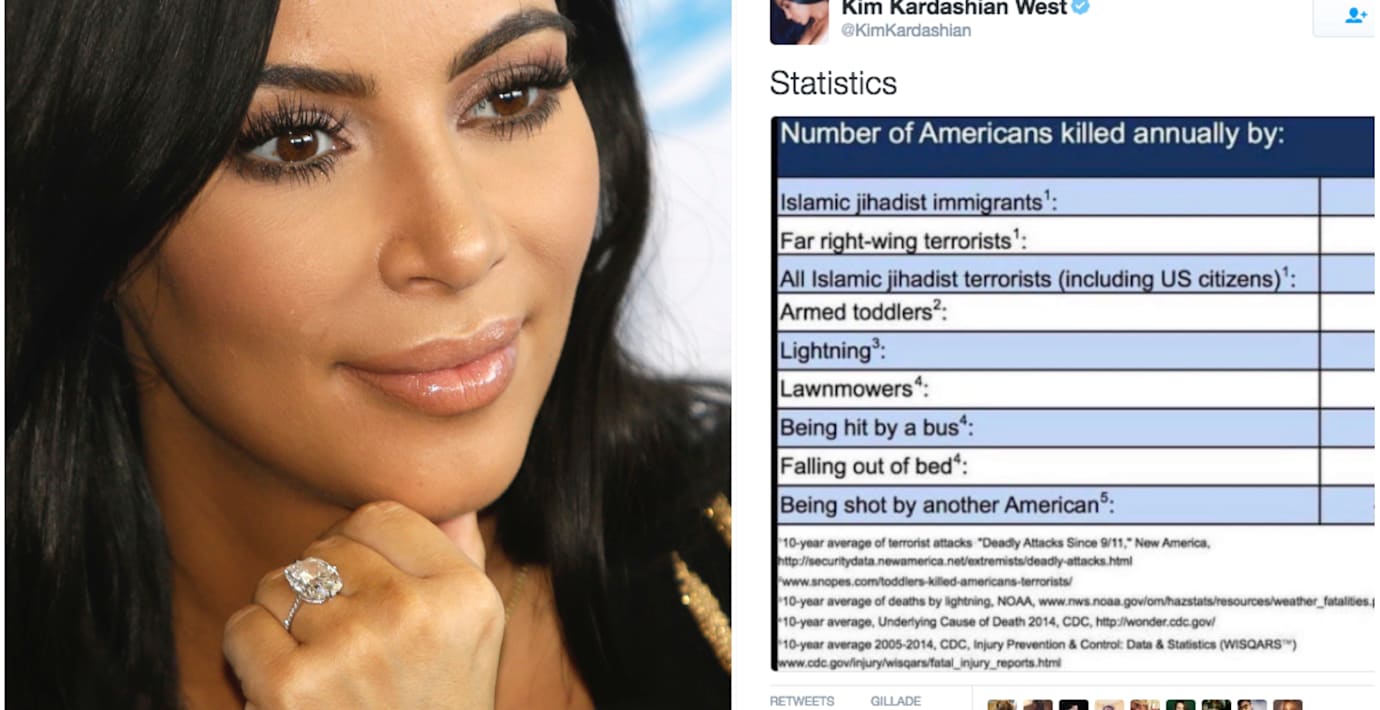 Realitystjärnan Kim Kardashian har publicerat en tweet där hon delat statistik över antal amerikaner som dött i olika situationer. Enligt siffrorna framkommer det att i genomsnitt nio amerikaner dödas årligen av islamiska jihadister, jämfört med 11 737 som blir skjutna varje år av andra amerikaner. Nu hyllas hon av sina fans som tolkar inlägget som ett ställningstagande mot Donald Trumps inreseförbud för medborgare från länder med muslimska majoriteter, skriver Aftonbladet.