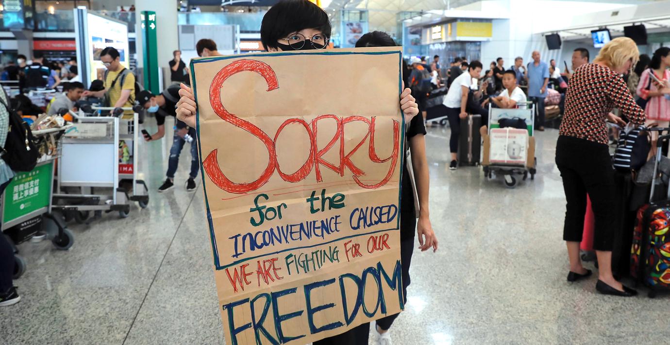 Kina fördömer demonstranterna i Hongkong i hårda ordalag efter de senaste dagarnas protester på flygplatsen. Enligt Kina ska demonstranter med våld ha attackerat en reporter från den statligt kontrollerade tidningen Global Times och en flygresenär från Fastlandskina.