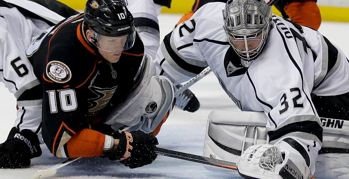 Matchen var i praktiken avgjord i början av den andra perioden när slovenen Anze Kopitar satte 4–0 bakom en olycklig John Gibson i hemmamålet. Hans ersättare Jonas Hiller släppte två puckar efter sitt inhopp. Svenske Hampus Lindholm spelade fram till Corey Perrys 2–5-reducering.