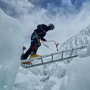 Hon befinner sig i baslägret, inte långt från den plats där ett stort isblock stoppar vägen upp mot toppen.